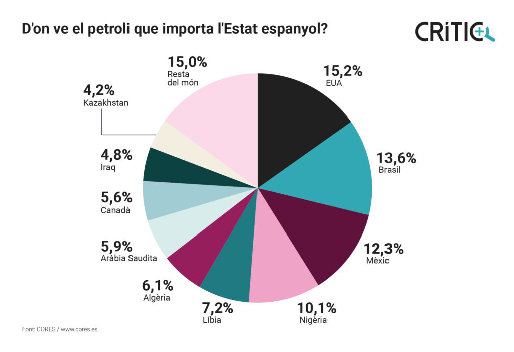 Com sabem, ni Catalunya ni Espanya no tenen reserves rellevants de petroli ni de gas. Tampoc de l’urani que necessiten les centrals nuclears com les d’Ascó, Vandellòs II o Cofrents. Això porta a una dependència energètica extrema de l’exterior. A Catalunya, no tenim dades específiques de les importacions per origen. Per al conjunt d’Espanya, d’acord amb la CORES (la font oficial de referència), el 2025 vam importar el petroli d’aquests països: